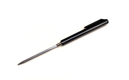 Bei diesem kleinen praktischen Taschenwetzstahl für Unterwegs befindet sich die Wetzklinge im Griff und kann bei Bedarf aufgeschraubt werden.